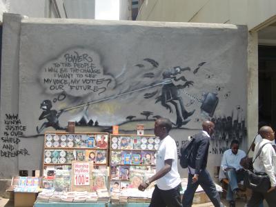 Ein weniger prominentes, aber nicht minder aussagekräftiges Bild befand sich an einem ähnlich belebten Platz in zentraler Lage. Es entstand kurz vor der Präsidentschaftswahl 2012 und schwimmt im Kielwasser der politischen Unruhen von 2007, als es nach Wahlfälschungen zu tödlichen Protesten im Land kam. Der altbekannte Aasgeier hält diesmal eine Wahlurne um sein Handgelenk gekettet. Um die Urne flattern Dollarnoten, was die Käuflichkeit des elektoralen Prozesses unterstreichen soll. Doch anders als im vorherigen Bild thront der Geier nicht über dem Volk, sondern wird von einem resoluten Wähler mit einer Schlinge festgehalten. Im Hintergrund brennt ein Dorf, bewaffnete Zivilisten lauern am Rand. Diese Aufforderung zum Kampf und zum Widerstand gegen die herrschende Klasse soll ein Signal an alle Mitbürger sein, sich nicht der Willkür des autoritären Regimes hinzugeben. Es ist ein Hilferuf nach Recht und Ordnung, nach Rechtsstaatlichkeit und Freiheit. In einer Sprechblase über dem Wähler steht: „Die Macht muss zurück zum Volk. Ich bin der Wechsel. Ich möchte meine Stimme sehen, meine Wahl und unsere Zukunft.“ Daneben verewigten die Künstler: „Die neue kenianische Justiz ist unser Schutz und Verteidiger“. Es ist ein Aufruf zur Gegenwehr, ein offener Brief voller Hoffnungen, eine Warnung an den Regierungspalast,
