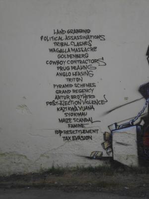 Diese Szene spielte sich in einer Nacht von Freitag auf Samstag ab. Der junge Mann stammt aus Kibera, einem Slum in Nairobi, der Hauptstadt von Kenia. Er selbst nennt sich Swift9 und avancierte jüngst als Graffiti-Aktionskünstler zu einer lokalen Berühmtheit. Seinen richtigen Namen möchte er aus Angst vor staatlichen Repressionen lieber geheim halten – obwohl er mit seinen Videos inzwischen zu einem Renner auf YouTube geworden ist. Doch der Rummel um seine Person ist ihm eher unangenehm. Es genügt ihm, dass er wöchentlich bei illegalen Graffiti-Aktionen seine Freiheit riskiert, um künstlerisch politische Missstände im Land öffentlich anzuprangern. Es wäre deshalb nicht übertrieben, den jungen Mann als Avantgardisten bezeichnen, denn gemeinsam mit seinen Mitstreitern veränderte er die politische Protestkultur in einem Land, das in der Vergangenheit immer wieder durch Bad Governance in den Fokus der Weltöffentlichkeit geriet.